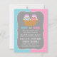 Laden Sie Ihre Gäste ein, in Ihren speziellen Nachrichten zu teilen! Junge oder Mädchen? Diese elegante und noble Einladung hat zwei Babyeulen mit niedlichen kleinen Nachthauben, ist eine Eule im Blau und im anderen im Rosa. Sie spähen aus dem Nest heraus. Neutraler grauer Hintergrund des Geschlechtes damit das Geschlecht nicht weg geben. Hintergrund der blauen Tupfen auf einer Seite und der rosa Tupfen auf der anderen. Personifizieren Sie leicht mit Ihren Partysonderkommandos.
