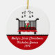 Elegante schwarze Krippe mit roten Betten und 1. Weihnachtsgeschenk Strumpf First Christmas. Fügen Sie Ihren Neugeborenen Namen und Geburtsdatum hinzu. Ideal für Urlaubsgeschenke oder als Geburtsankündigung versenden. Denken Sie daran, ein Foto Ihres kleinen auf der Rückseite des Ornaments hinzuzufügen!