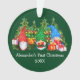Die erste Weihnachtswasserfarbe des Babys mit Weihnachtsgeschenken und Kiefernbäumen-Ornament. Grüner Hintergrund und Stringleuchten. Name hinzufügen.