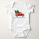 Das Baby First Christmas Baby Bodysuit Shirt beinhaltet einen Vintagen Truck mit Weihnachtsbäumen, Lichtern, Schnee und Weihnachtsgeschenken.