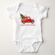 Das Baby First Christmas Baby Bodysuit Shirt beinhaltet einen Vintagen Truck mit Weihnachtsbaum, Schnee, Weihnachtsgeschenke und Bonbons.