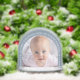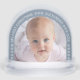 Es gibt ein Platzhalter-Babyfoto in einem Bogen, umgeben von einem dusty blauen Bogen mit weißem Text und Schneemflocken.