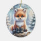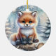 This gentle baby fox with blue eyes and a fluffy coat rests on a snowy log beneath twinkling stars. A serene and magical forest scene perfect for cozy holiday vibes and woodland lovers.