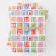 Ein Trio von bezaubernden Umhüllungspapieren mit einem sich wiederholenden, nahtlosen Gebäude aus Baby-Blöcken mit dem Alphabet und Zahlen in Rosa, Blau, Grün, Orange, Rot und Gelb. Sie eignen sich ideal für eine Babydusche. Ankunft des Neugeborenen; Geburtstagsfeiern und Feiern.