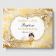 Wunderschönes Baby in ihrem Taufkleid und goldene Kreuzhalskette auf einem goldenen Kissen schlafend. Hintergrund ist Gold mit silberner Schriftrolle und Kreuzverzierung. Zurück ist mit Band und Kreuz geschmückt.