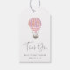 Benutzen Sie diese süßen Babydusche Gefälligkeitstags, um sich bei Ihren Gästen zu bedanken! Niedliches zeitgenössisches Design für junge Mädchen auf dem Weg bietet eine rosa und pfirsichfarbene Heißluftballon-Illustration und rauchblaue graue Schrift.