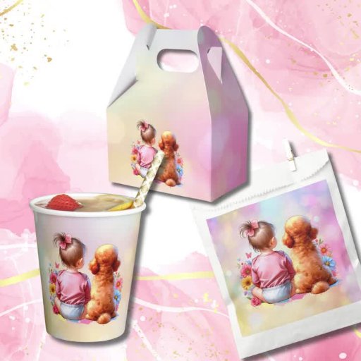 Baby Shower Papier Becher. Hübsche Aquarellkunst, die ein kleines Mädchen mit einem rosa Bug zeigt, das neben ihrem Apricot Poodle sitzt und von Blume umgeben ist. Es ist ein Mädchen! Rosa und lila.