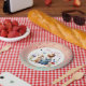 Es ist ein Girl-Teller. Hübsche Aquarellkunst, die einen Rückblick auf ein kleines Mädchen zeigt, das mit ihrem kleinen, weißen Labrador sitzt. Sie sind von Blume, Schmetterlingen und Vögeln umgeben. Die verwendeten Farben sind rosa, lila, rot und blau. Das kleine Mädchen trägt niedliche kleine Overalls und hat ein niedliches, lockiges, blondes Haar.