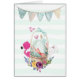 Eine Babydusche/Babydusche-Begrüßungskarte mit einem Banner, der über einer niedlichen Aquarell-Abbildung eines Eis in einem Korbkorb aufgehängt ist. Mit Bändern, Bögen, Blume und kleinen Herzen dekoriert. Ein rosa Flamingo und ein weißes Hasen sitzen auf beiden Seiten geduldig für den großen Tag gewartet. Die Innenseite der Karte hat einen Banner und eine personalisierte Nachricht.