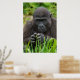 Ein niedliches Gorilla Baby mit durchstechenden, glänzenden Augen. Sitzen zwischen dem Gras und Blätter. Seine kleinen Hände und Finger halten an einem kleinen Stück Essen fest.