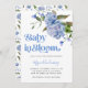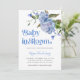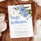 Rustikale und elegante Blumen-Design Baby Dusche Einladungskarte mit Aquarellbild einer blauen Blume. Im Text steht "Baby in Blüte". Ideal für eine Babydusche.