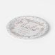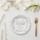 This elegant “Baby in Bloom” baby shower paper plate features a romantic vintage floral pattern with soft blush pink bows, delicate blue ribbon accents, and dainty botanical details inspired by heirloom wallpaper designs. The graceful script “baby” lettering paired with classic serif typography creates a timeless, feminine aesthetic that instantly elevates your baby shower table décor.