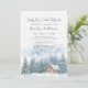 The front features a peaceful winter scene with a tan brown log cabin nestled at the bottom, surrounded by tall pine trees and gentle snowfall. The snowy ground and white sky create a clean, quiet backdrop for your event details. At the top, “Baby It’s Cold Outside” is written in a soft gray mix of handwritten script and classic serif fonts, adding a touch of elegance to the rustic design.