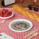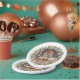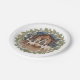 Diese traditionelle Weihnachtsplatte zeigt ein Krippenbild des Jesus-Babys, das in einer Manier mit Maria und Joseph in der Mitte schläft. Die Krippe ist von einem Kranz mit weißen Beeren umgeben. Der Hintergrund ist hell weiß.