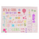 Eine schöne Komposition aus verschiedenen bunten Schriftart und kleinen Elementen, um ein neues Baby Mädchen willkommen zu heißen.