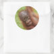 Eine fröhliche Baby-Orang-Utan wird mit einem erfreulichen Ausdruck gesehen, der sicher am Rücken seiner Mutter festhält. Die Atmosphäre ist von üppigem, hellen Grün umgeben