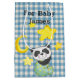 Niedlicher Babypanda mit hellgelbem Mond und Sternen auf blauem Gingham-Muster. Text ist bearbeitbar.