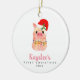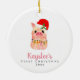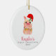 Baby Pig First Christmas Custom Keramik Ornament - Die wertvolle personalisierte Weihnachtsschmuck-Vorlage verfügt über ein bezauberndes Aquarellpiglet und eine Piggie trägt eine Weihnachtsmannmütze und ein in den Ferien verschlungener. Die Textfelder ermöglichen eine einfache Anpassung des Babynamens in einem handgeschriebenen, fett rosa Kalligraphieskript-Schriftart und das Geburtsjahr in einer einfachen, minimalistischen Sans Serif. Beide Seiten dieser personalisierbaren Sake-Baum-Dekoration sind identisch.