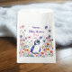 Ein niedlicher Pinguin, umgeben von rosa, blau, orange und violett blühenden Aquarellbildern, das Baby Dusche personalisierte Leckerei Gefallen Taschen.