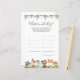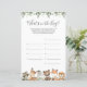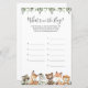 Woodland Tiere Themed Baby Dusche raten, was in der Taschenspielerkarte ist eine Aquarellwoodland Tiere Illustration und Aquarell Grüne eucalyptus Garland und elegante handgeschriebene Stil Schriftart.