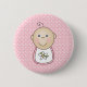 Ein entzückender Babyknopf und -magnet, die ein Baby trägt einen rosa geblühten Schellfisch gegen eine rosa und weiße Polka kennzeichnet, punktierten Hintergrund. Fertigen Sie sie sofort mit einem Namen oder anderem Text besonders an!