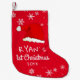 Niedlich Baby`s First Christmas Red Weihnachtsmannmütze Snowflake Kleiner Weihnachtsfest Strumpf. Weihnachtsdesign für ein kleines Mädchen oder einen kleinen Jungen. Niedliches Baby First Christmas Design mit einer Weihnachtsmannmütze, Schneeflocken und einem Babynamen und Geburtsjahr in einem weißen Drehbuch auf rotem Hintergrund.