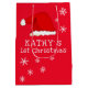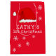 Baby`s erste Weihnachts Rote Weihnachtsmannmütze Snowflake Geschenktasche. Niedliches Baby First Christmas Design mit einer Weihnachtsmannmütze, Schneeflocken und einem Babynamen in einem weißen Drehbuch - personalisieren Sie mit dem Namen Ihres Babys.
