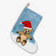 Niedlich Blue Baby`s First Christmas Blue Teddy Bear Weihnachtsmannmütze Baby Christmas Strumpf. Niedlicher Teddybär mit roter Weihnachtsmannmütze. Der Hintergrund ist blau mit weißen Schneeflocken und blauen Aquarellbäumen. Füge Deinen Namen hinzu.