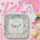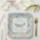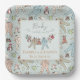 Diese geschlechtsneutralen Winter- oder Feiertagssaison Baby Shower Papier Teller bieten niedliche handgezeichnet Illustrationen von Weihnachts-Pjama-Bodysanzügen und Plüschtiere auf einer Wäscheleine und personalisierbaren Namen und Veranstaltungen. Eleganter, weicher grüner Hintergrund.