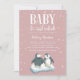 Niedliche Baby Duscheinladung mit Illustration von Pinguinen auf einem Eisberg. Im Text oben steht "Baby seine Kälte draußen". Ideal für die Dusche eines Mädchens.