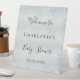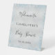 Ein Willkommensschild für eine Babydusche, die einen kleinen Jungen feiert. Ein Imitat silber aussehender Hintergrund mit hellblauen Imitat Glitzer, Glitzern. Personalisieren und fügen Sie einen Namen und ein Datum hinzu.