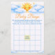 Fun and interactive baby shower bingo game card featuring a cheerful sunshine theme with a smiling sun, soft clouds, and bright stars. Perfect for entertaining guests and adding excitement to your baby shower party. This printable-style game card matches sunshine baby shower decorations and creates a joyful group activity everyone will enjoy.