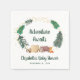 Niedliche Babydusche-Servietten mit einer Darstellung von Waldtieren mit ihrem Zelt-Camping in Bergen und Wäldern, einem Overlay von Goldstern, "Adventure Awaits" und dem Namen der Mutter, die in einem dunkelgrünen Drehbuch zu sehen ist.