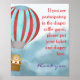 Diaper raffle game party sign for baby shower features a cute cub in a hot air balloon flying over the clouds.