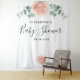 Elegant, classic, modern floral style baby shower banner, tapestry celebrating a baby girl. Decorated with pink and rose gold colored watercolored peonies, florals flowers and eucalyptus greenery. With the text: Baby Shower written with a large, modern black colored hand lettered style script. Personalize and add the name of the mother to be, and a date.
