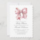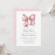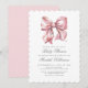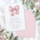 Ein süßes und klassisches rosa Schleifen-Baby-Shower-Thema mit einer bezaubernden, weichrosa Wasserfarbe-Schleife. Dieses Design sorgt für einen einfachen, minimalistischen und zeitlosen Baby-Shower-Look mit einer süßen, weiblichen Note. Der Text erscheint in weichen grauen Schriften, wobei eine Mischung aus eleganten Serif- und fließenden Script-Schriftarten verwendet wird, um alles sauber und charmant zu halten.