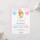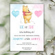 Baby shower invitation featuring a bear hugging a red heart balloon, with blue and pink accents. Text reads: "He or She, What Will Baby Be?"