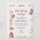Baby shower invitation with playful elements like teddy bear, baby bottle, heart, and vintage car. Text reads 'She's Ready To Pop!' in a cheerful font."