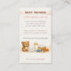 The design includes a teddy bear, woodland accents, baby bottles, diapers, pacifiers, raffle tickets, and a hedgehog toy, all set against a soft marble background. This whimsical woodland theme blends charm with functionality, perfect for rustic, nature-inspired, or woodland baby showers.