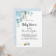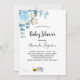 Für eine Babydusche, um einen kleinen Jungen zu feiern. Ein schick weißer Hintergrund. Die Einrichtung besteht aus hellblauer Rose, Blume, blühender und graugrüner Eukalyptusgrün, Blätter, einem goldenen Gewürz und einer niedlichen glücklichen lächelnden Biene, die einen Umschlag trägt. Personalisieren und fügen Sie einen Namen und Party-Details hinzu. Schwarze Buchstaben. Der Text: Baby Shower und der Name der Mutter zu sein geschrieben werden mit einem modernen handgeschriebenen Stil Skript. Zurück: hellblaue Hintergrundfarbe und die glückliche lächelnde Biene.