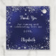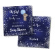 Für eine Babydusche, die einen kleinen Jungen feiert. Ein marineblauer Hintergrund. Die blaue Farbe ist ungleichmäßig. Ein Teddybär, der einen blauen Ballon hält, und Imitate silberne Glitzern. Zurück: Der Text: Danke, danke, dass du dir notiert hast, und der Name der Mutter, die du sein willst.