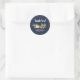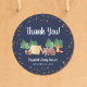 Niedliche Aufkleber für Ihre Babyduschfavors und Korrespondenz mit einer Abbildung von Waldtieren mit ihrem Zelt-Camping in Bergen und Wäldern unter einem nachts blauen Himmel, einem Overlay von Goldstern, und "Danke!" und dem Namen der Mutter, die ich sein soll, in einem weißen Drehbuch.