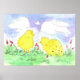 Ein Aquarellbild von drei flauschigen Frühlingshühnern, die auf der Weide picken, mit roten Wildblumen, die mit Aquarell gezeichnet werden.