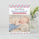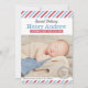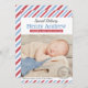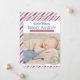Mit diesen Vintagen inspirierten Foto-Geburtsankündigungskarten kündigen Sie Ihr Baby stilvoll an: ein spezielles Luftpost-Thema, eine klassische rote, weiße und blaue diagonal gestreifte Grenze und eine kohlegraue runde Briefmarke.