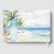 Ein Strand mit feinem Sand, Meereswellen und Palmen als Hintergrund und ein blaues Surfbrett am Strand. Text: Baby an Bord.