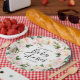 Babydusche Aquarell florale botanische Illustration moderne elegante Schrift. Pfirsichrosa und Zitronenfarben schöne Blume moderne Baby Dusche Party Papier Teller. Teil einer Indie-Sammlung.