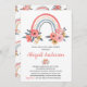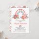 Persönlich gestalten Sie diese Coral Blush Pink Floral Watercolor Vintag Style Rainbow Baby Girl Baby Shower oder Baby Sprinkle Einladung auf weißem Hintergrund mit Ihrer Nachricht und Details. Diese schicke Einladung beinhaltet Blume der Rose und moderne botanische Vegetation mit niedlicher und eleganter Schrift-Typografie für die besondere Mutter zu sein zu feiern.