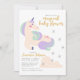 Celebra tu ducha de bebé con estilo con esta mágica invitación a unicornio de acuarela. Este krankño cuenta con una tipografía de juego de oro fauch y un tipo de letra simple para tu información, y unas imágenes de acuarela adorables de un unicornio, nube y estrellas para una elegante feiración de una ducha de bebé. El reverso muestra los colores de los dulces de algodón de arcoiris pastel, que Combinan perfektamente con la paleta de colores de la invitación. Crea tus propias invitaciones haciendo clik en el botón "Personalizar" y cambiando la plantilla de texto a la tuya. ¡Perfecto para una ducha de bebé dulce!