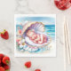 Babyduschenservietten für Mädchen. Gemütliche Pastellrosa, Korallen, aquamarin, blau und goldfarbene Babydusche an der Küste. Ein kleines Mädchen schlafend in einer Weile und Gold Muschel. Hübsche skurrile tropische Blume. Seepferd in Aquarellfarbe, Sand Dollar, tropische Blume und Seesterne.