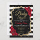 Baby Dusche Einladung Elegantes Schwarz-weißes rotes Design mit Imitat Glitzer. Schwarzweißstreifen mit rote Rosen. Ideal für eine stilvolle Babydusche.